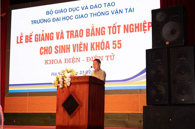 Phát biểu tại buổi lễ, PGS.TS Nguyễn Cảnh Minh – Trưởng khoa Điện-Điện tử ghi nhận những nỗ lực của các em sinh viên trong quá trình học tập, rèn luyện tại Trường Đại học GTVT. Thầy cũng có những chia sẽ gần gũi và hết sức bổ ích giành cho các tân kỹ sư, đồng thời chúc mừng 244 tân kỹ sư khóa 55 Khoa Điện - Điện tử.